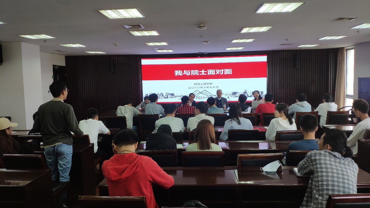 聘任仪式结束后,学院举行了“我与院士面对面”座谈交流活动。黄崇祺院士与同学们分享了自己的求学和成长经历,将自己在科研道路上如何克服艰难困苦最终有所成就,如何将个人发展与国家科技进步紧密结合的历程,向同学们娓娓道来。黄院士的分享既有高度又接地气,既平易近人又幽默风趣,平实的言语中透着朴素而浓厚的爱国情怀和崇高而坚定的信仰力量,令人肃然起敬。他说,材料学科是推动人类发展进步的动力,作为材料人要有专业自豪感、使命感和奉献精神,要“立大志”“长本领”“成栋梁”,投身祖国需要、实业救国。黄黄崇祺院士殷切嘱咐青年学生要坚定正确的政治方向,坚守学术道德和“严肃、严厉、严格”的研究态度,坚持锻炼保持健康体魄,同时切忌好高骛远,要先“专”后“博”,重视学习与实践的知行合一,终身学习、勇攀高峰。