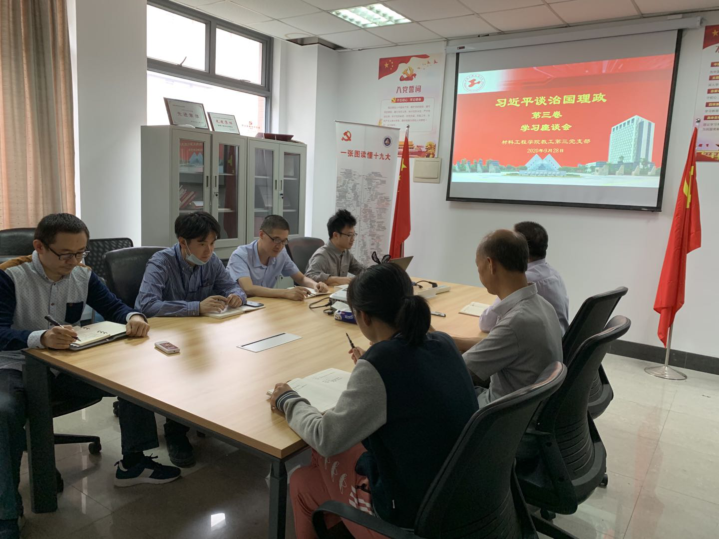9月28日下午,材料工程学院教工第三党支部在实训一号楼1213会议室开展了《习近平谈治国理政》第三卷学习座谈会,支部全体党员参加学习,会议由支部书记李绍伟主持。