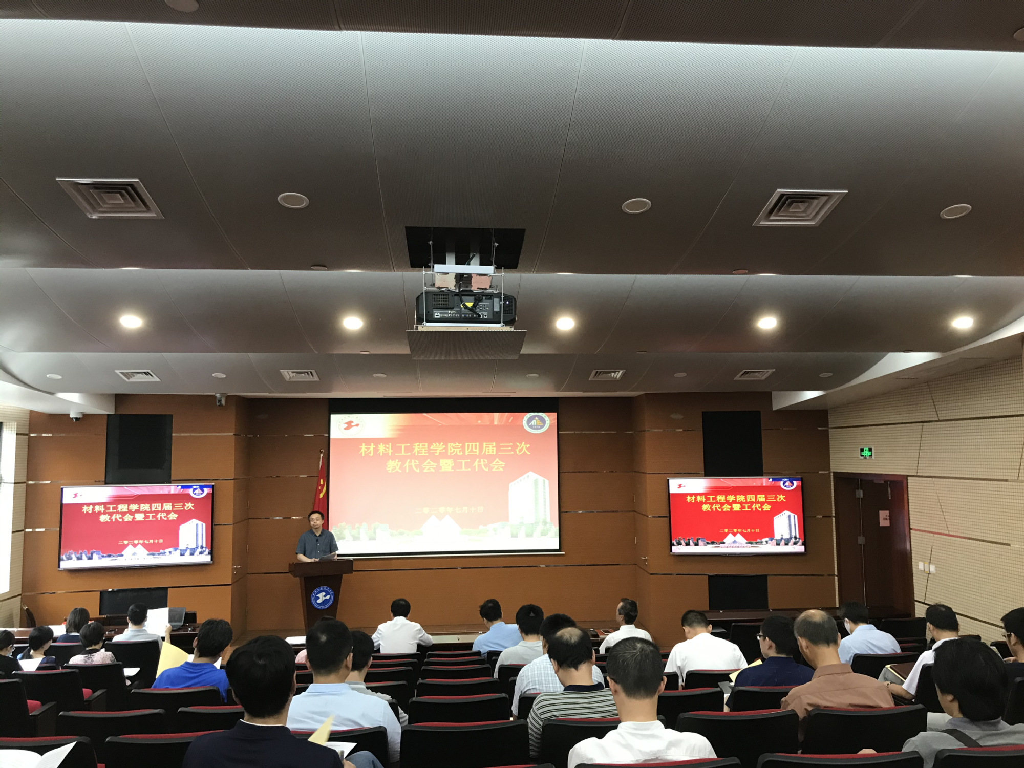 7月10日下午,材料工程学院在航飞楼一楼报告厅举行材料工程学院第四届第三次教代会暨工代会(简称“双代会”)。参加会议的有校工会常务副主席柳如荣、材料工程学院党政负责人、教代会代表、列席代表等。会议由学院工会主席冷培榆主持。