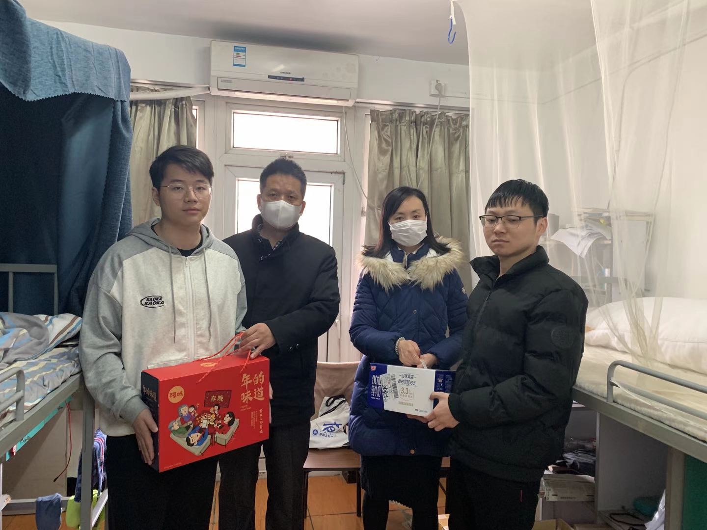 张朝民书记代表学院向学生们表达了全院教职工对他们的关心,向留校学生送上了牛奶、坚果大礼包、防疫物资等新春礼品。张书记详细了解了留校学生的生活、学习以及家里情况,要求留校学生严格遵守学校疫情防控的各项管理规定,做好个人防护,在学校过一个平安祥和的春节。