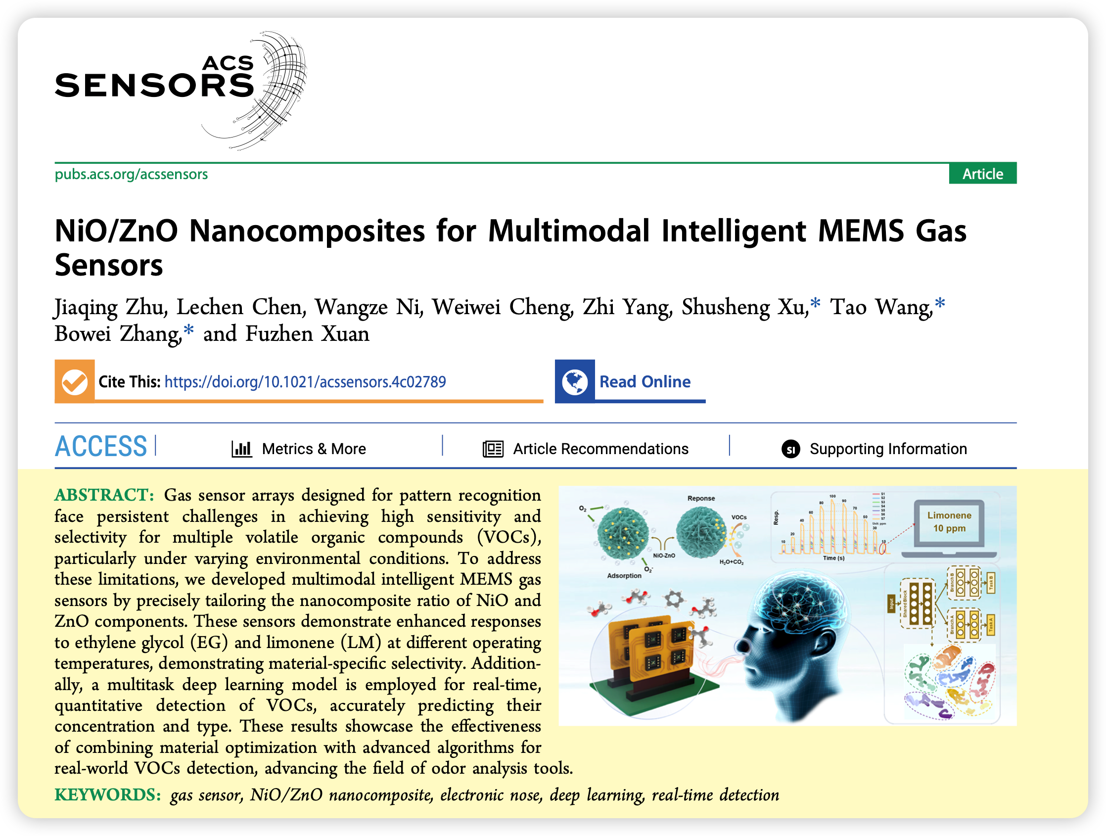 近日,bevictor伟德官网徐书生博士指导硕士研究生朱佳清在传感器学科国际顶级学术期刊《ACS Sensors》(中科院一区Top,影响因子8.3)上发表了题为“NiO/ZnO Nanocomposites for Multimodal Intelligent MEMS Gas Sensors”的研究论文。徐书生为第一通讯作者,朱佳清为第一作者,华东理工大学的张博威教授和王涛副研究员为本论文的共同通讯作者。